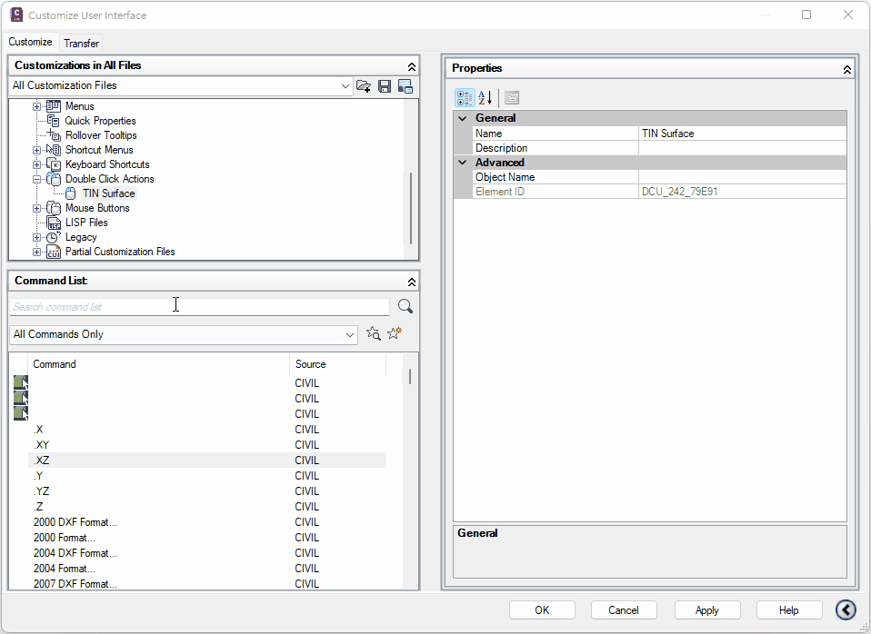 Bij Object Name wordt de DXF naam van een object verwacht. Dat klinkt wat complex maar dat is de objectnaam die Civil 3D intern gebruikt om een object te herkennen. Je kunt deze naam opvragen via het bekende LIST commando. Selecteer een TIN Surface en je ziet de naam ‘AECC_TIN_SURFACE’ staan. Dat is de DXF naam. Kopieer deze en plak de waarde in het veld in de CUI editor.