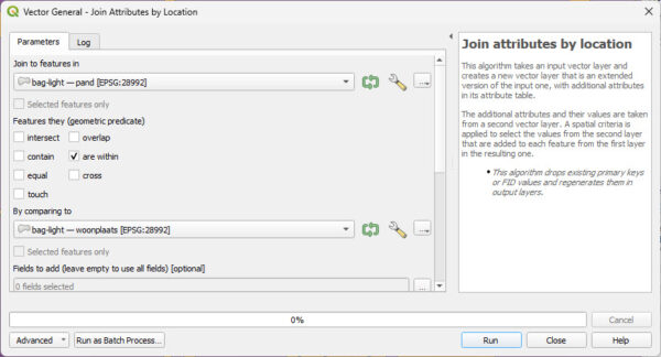Wil je de pand-geometrie gebruiken, dan kun je de functie Join attributes by location toepassen. Er wordt dan een nieuwe laag gemaakt van de laag ‘panden’ en voorzien van de data van de laag ‘woonplaats’, als ze matchen met de ingestelde geometrische overeenkomst (‘vallen binnen’).