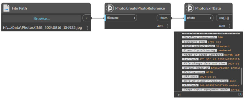 In Dynamo maak je een Photo Reference naar je foto en dan kun je de Exif Data lezen.
